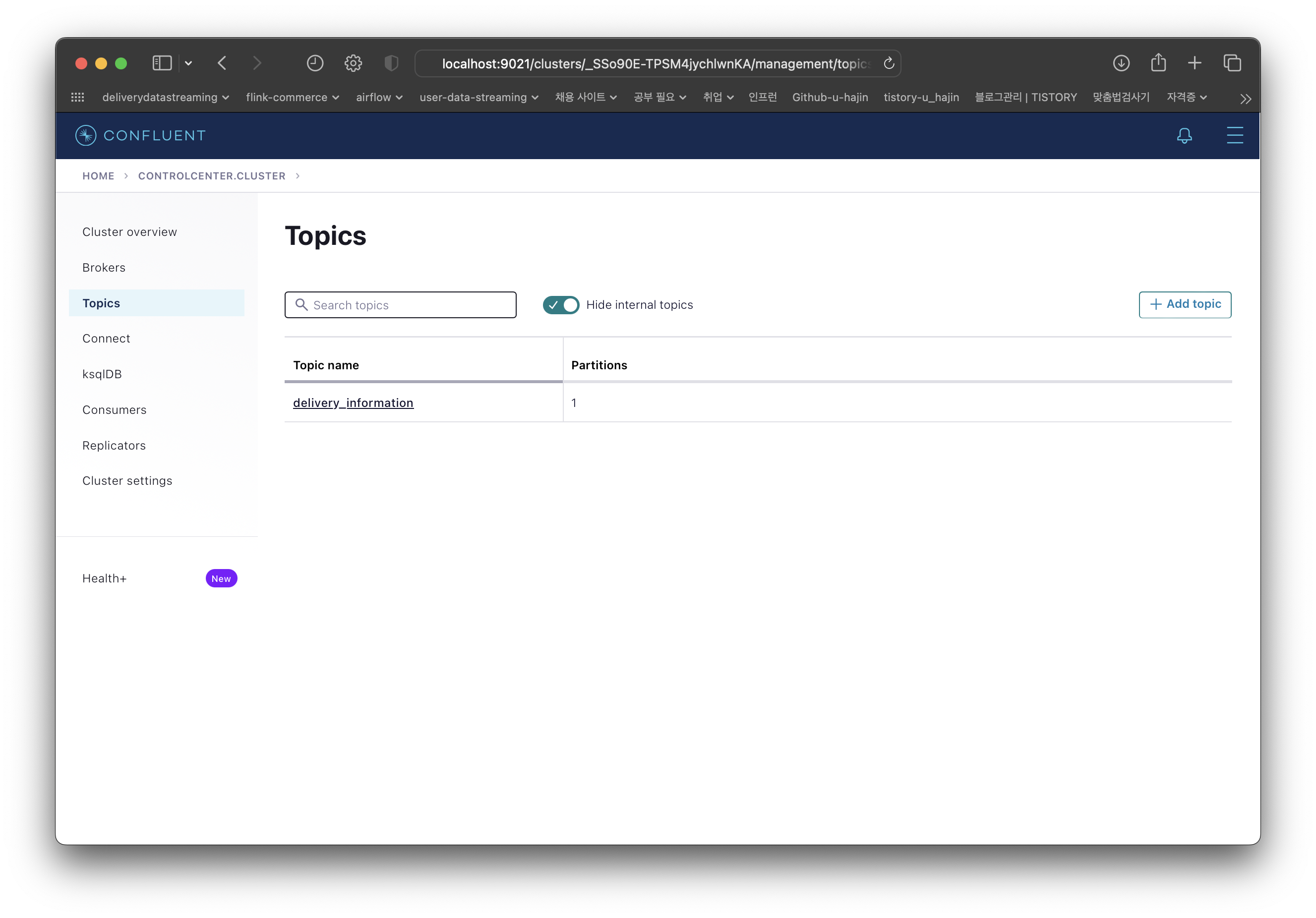실제 kafka에 메시지가 잘 publish 되는지 확인하기 위해 localhost:9021에 접속해본다.