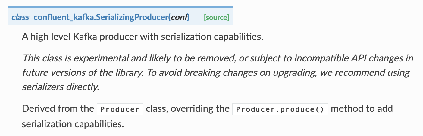 Docs » confluent_kafka API View page source confluent_kafka API A reliable, performant and feature-rich Python client for Apache Kafka v0.8 and above. Guides Client API Serialization API Supporting classes ExperimentalThese classes are experimental and ar