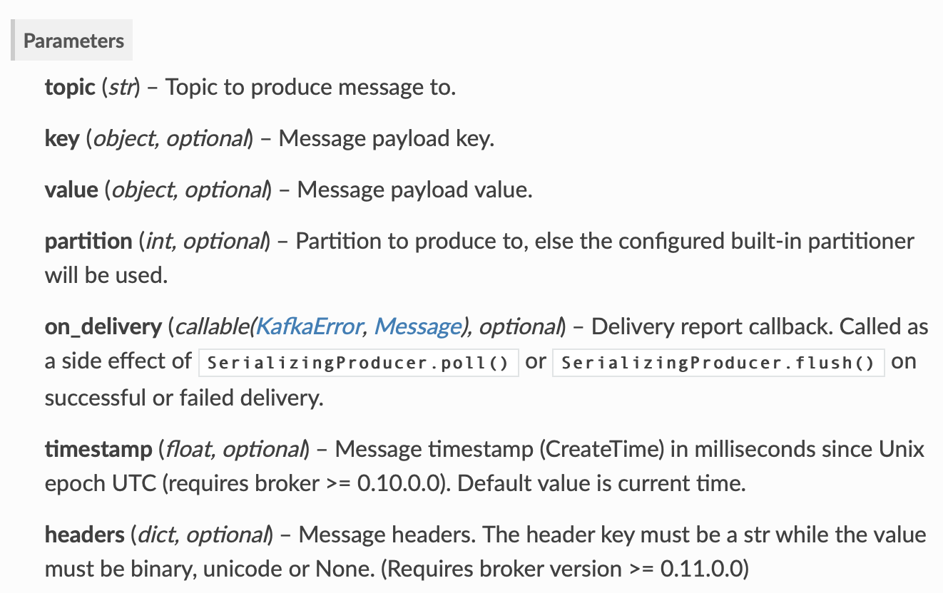 produce 함수의 파라미터 설명이다. topic, key, value, on_delivery만 넘겨주면 될 것 같다.