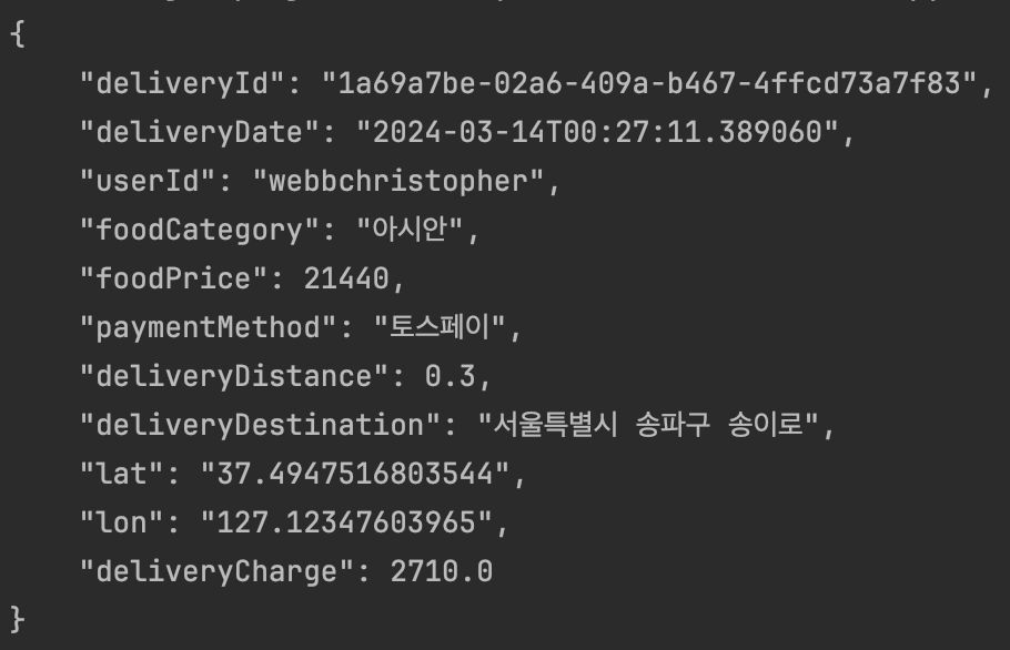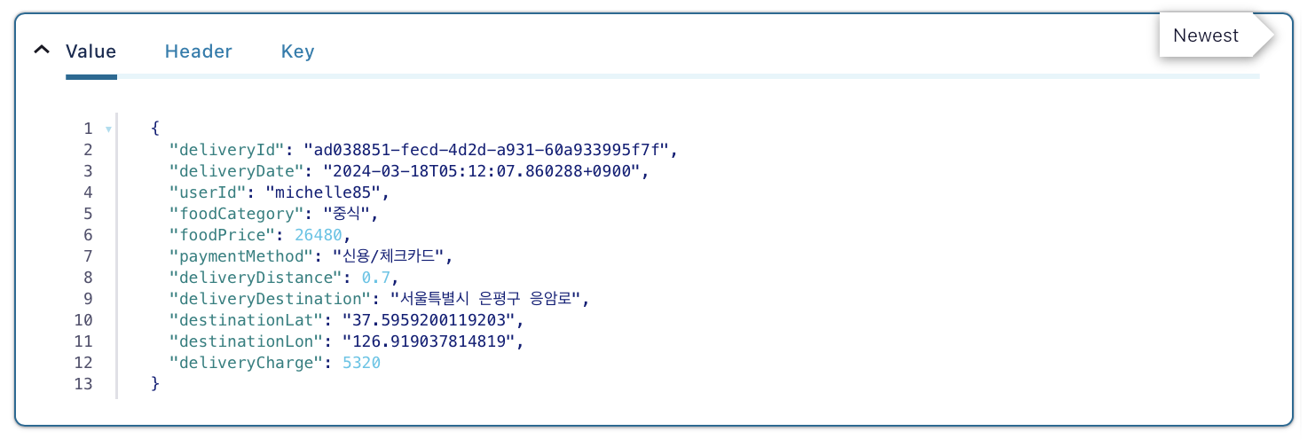 Topic 이름은 delivery_information이고 key 값은 생성한 데이터의 deliveryId로 지정했다.
