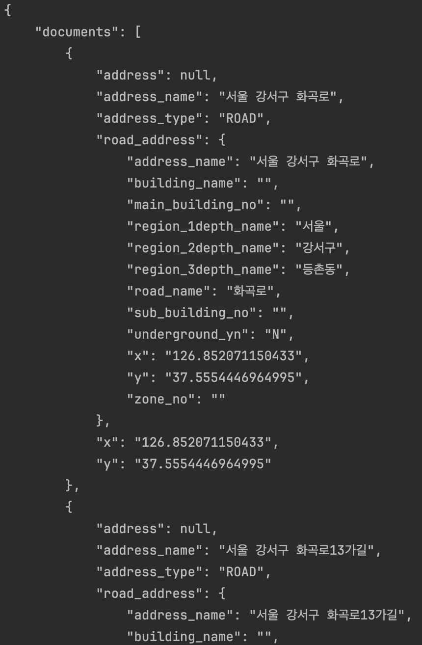 '서울특별시 강서구 화곡로'를 입력하면 얻을 수 있는 값인데 '화곡로'가 포함된 모든 주소에 대한 정보가 포함되어 있다. 이 중 맨 처음 요소의 위도, 경도를 사용하기로 결정했다.