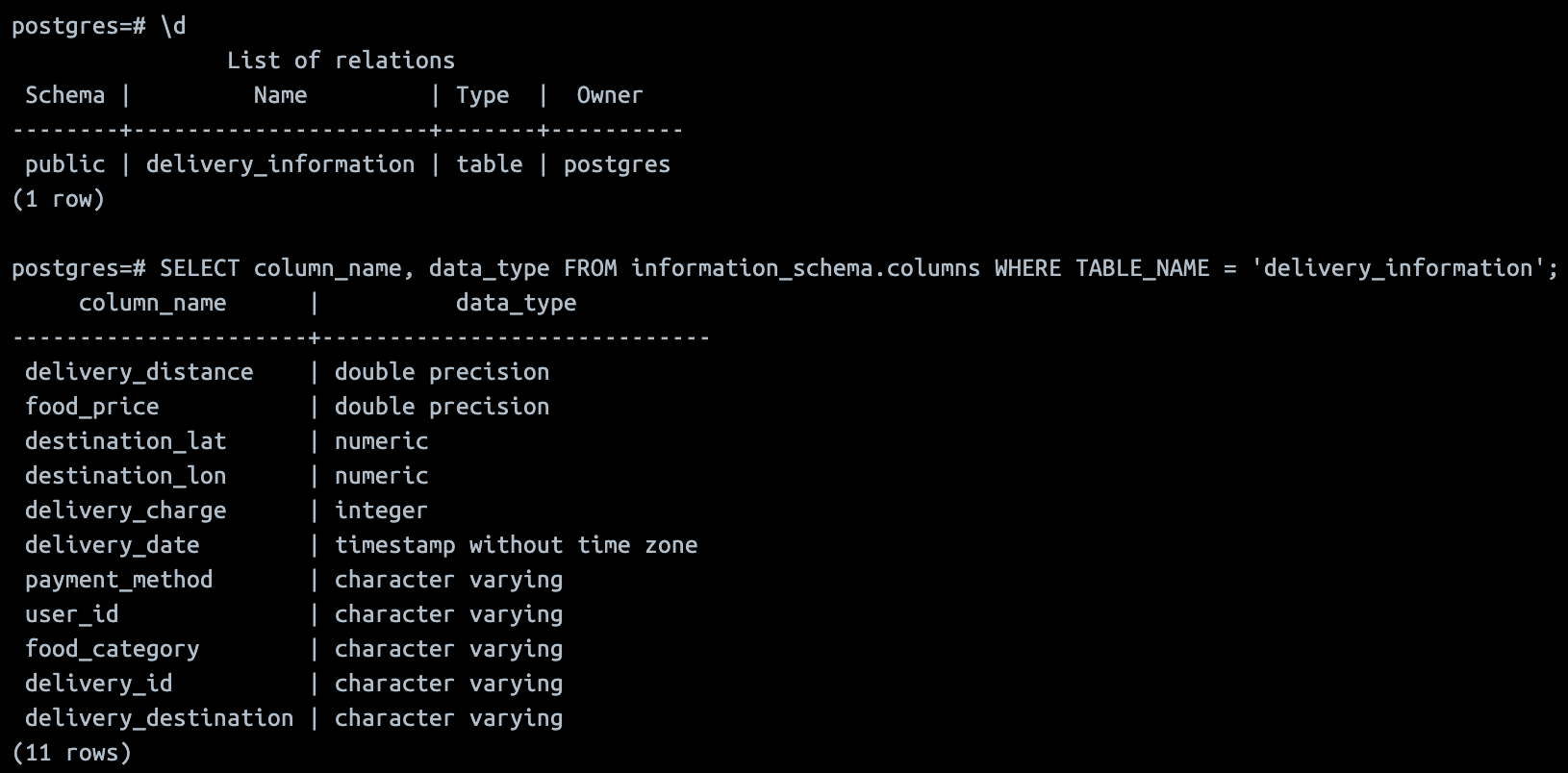 사실 delivery_information 테이블만 있으면 쿼리 실행을 통해 나머지 3개 테이블과 동일한 결과를 얻을 수 있다. 그럼에도 나머지 3개의 테이블을 생성하는 이유는 데이터 스트림에 map, reduce 등 여러가지 처리 및 집계 연산을 적용해보기 위해서다.