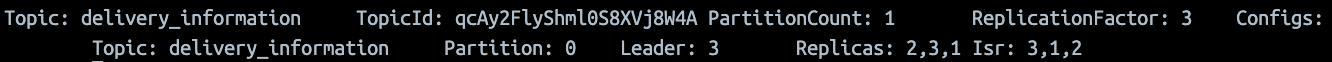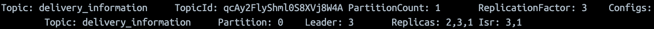 Topic 정보를 확인해보면 partition은 1개, replication factor는 3으로 설정되어 있다. 현재 해당 파티션에 리더 ID는 2이고 복제본이 1, 2, 3 브로커에 있다는 것을 확인할 수 있다. 리더, 팔로워 그룹 역시 1, 2, 3으로 구성되어 있어 데이터가 동기화된 것을 알 수 있다.