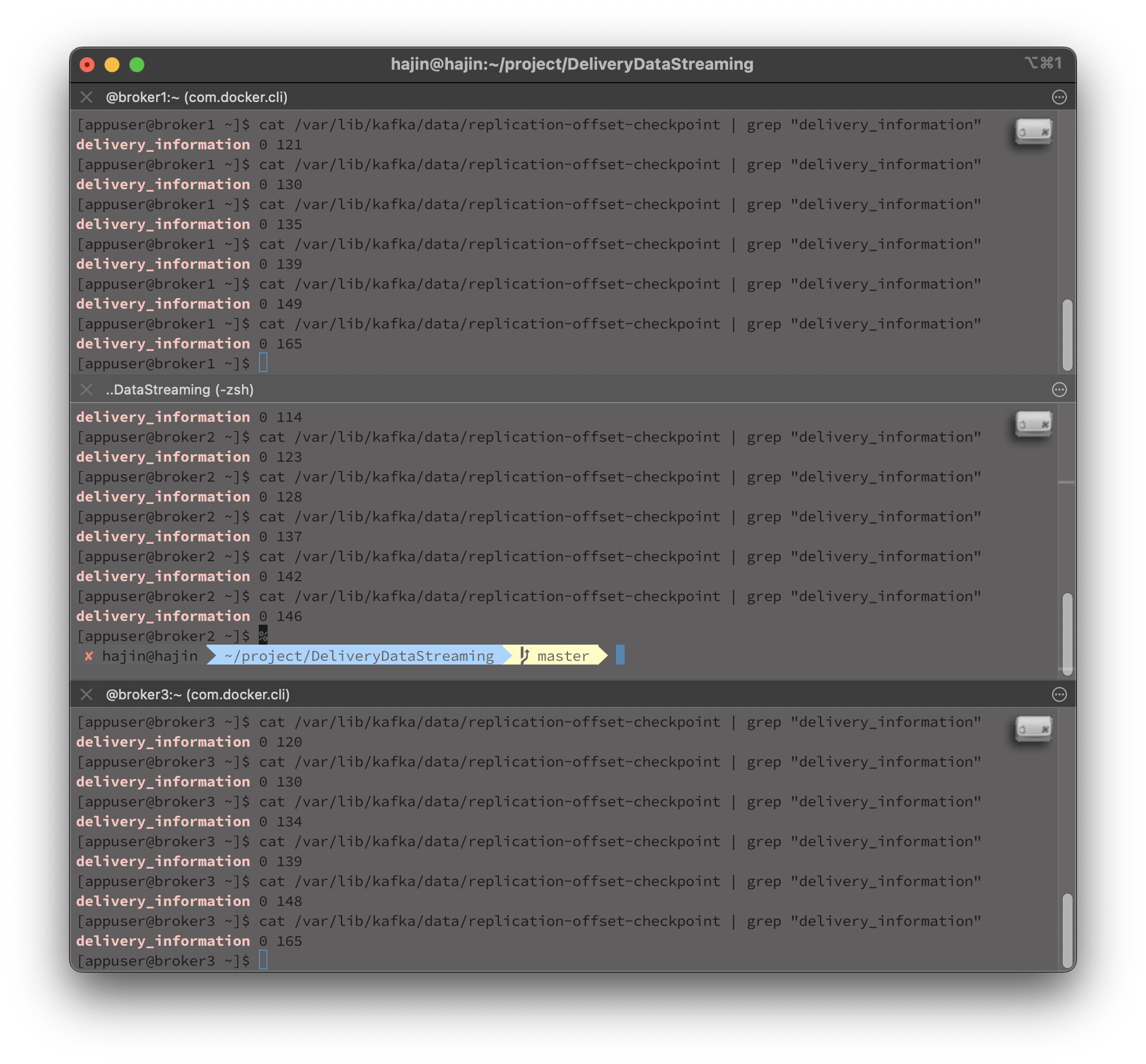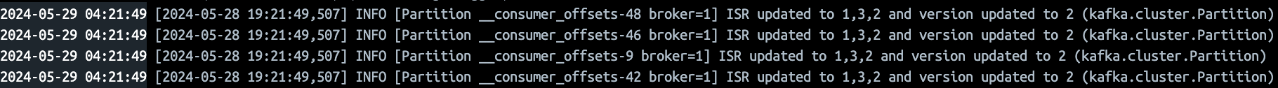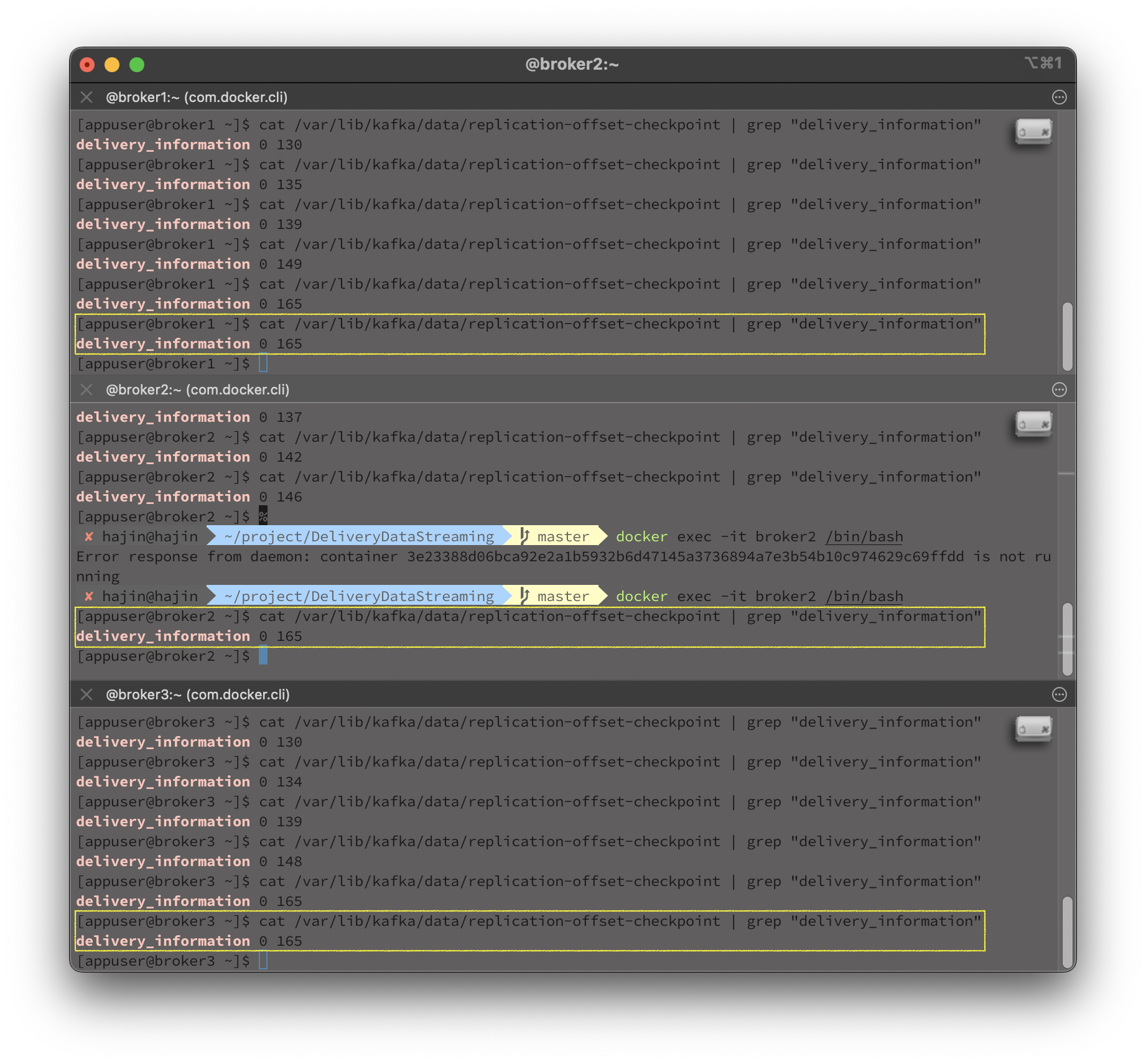 메시지가 publish될 때 broker1, broker3 동일 토픽의 커밋 오프셋을 확인해보면 모두 동일하다. 중간에 broker2를 강제로 종료했다. broker2를 재시작 했을 때 정상적으로 복구 되었으면 커밋 오프셋이 165, 즉 다른 브로커들의 파티션 복제 오프셋 값과 동일해야 한다.
